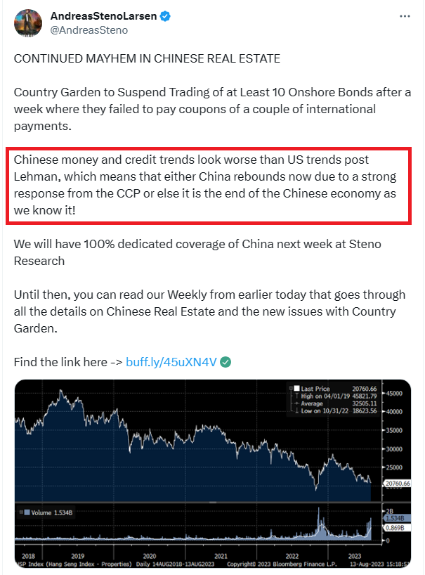 Chinese real estate is in free fall. This is 70% of household wealth evaporating. Also think of this in context that the CCP is trying to transition to a consumer led economy, because they know they are completely dependent on globalization and other people buying their stuff. The CCP is pushing for this right as 70% of household wealth is disappearing.