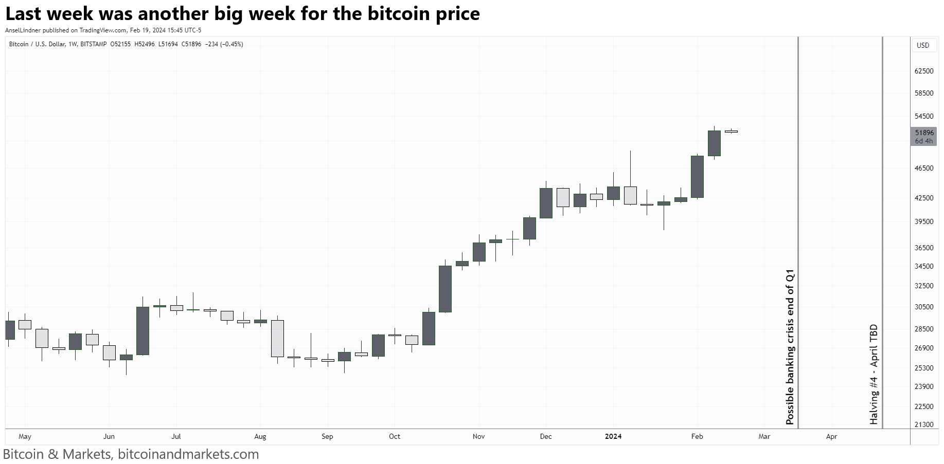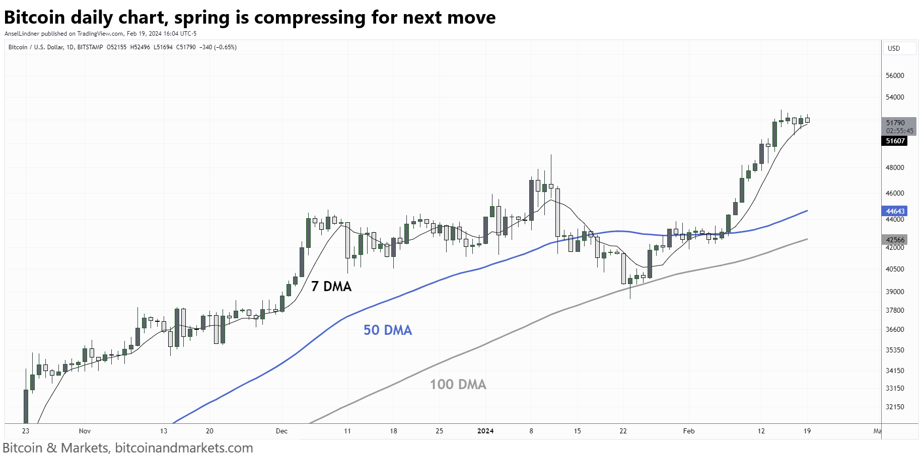 We are in a similar position to last week when it comes to indicators. There is still room to move higher to the high $50k's before a drawn out consolidation. I think this cycle will be characterized more by sideways consolidations instead of rapid 20% crashes of previous cycles.
