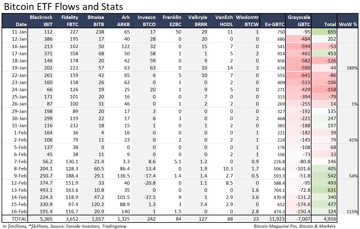 Last week was the largest week for net inflows into the Bitcoin ETFs, up 115% week-over-week, for a total of $4.9 BILLION. Blackrock's IBIT alone had $1.6 billion inflows last week.