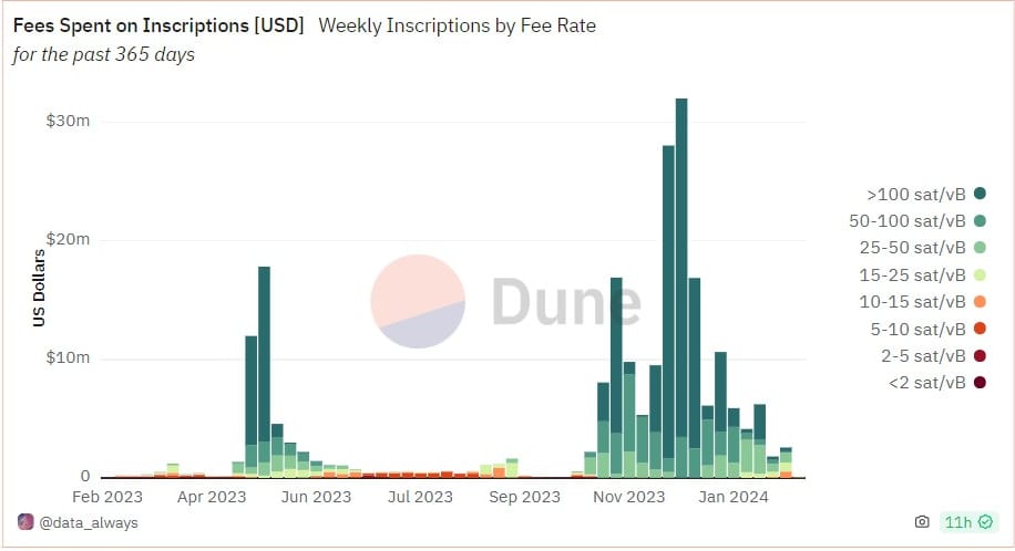 Fees paid by inscriptions remains very low, under $5 million/week.