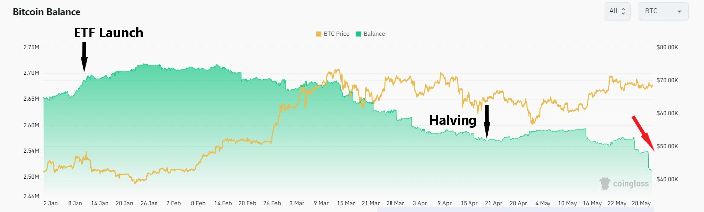 The amount of bitcoin on exchanges plunged this week. On the chart below, you can see that exchange reserves fell from 2.57 million BTC on May 26th, to 2.51 million BTC today. That is approximately $4 billion in liquidity getting removed from exchanges. Based on this data, there is likely some volatility in the near future. - me on BitcoinMagazinePro.com