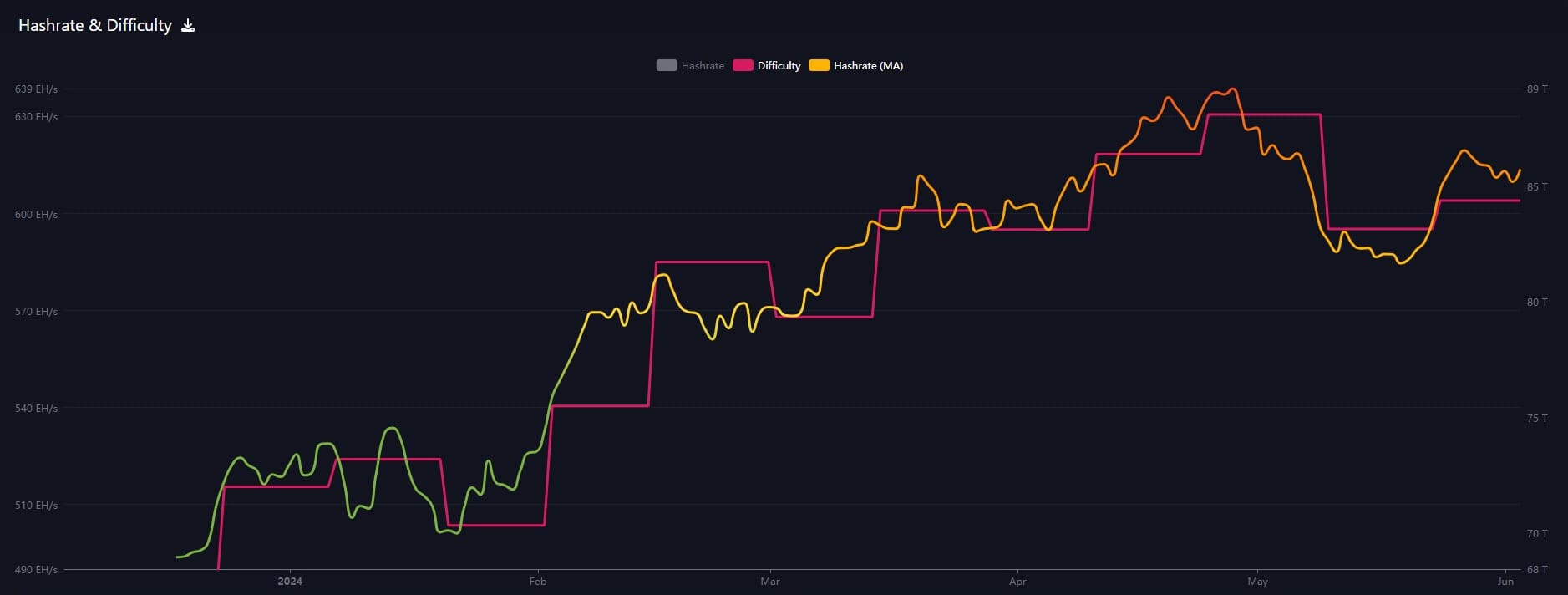 Hash rate has maintained its gains from last week. The next difficulty adjustment will be in 2 days and is estimated to be +1.5%.