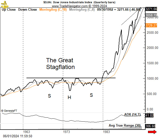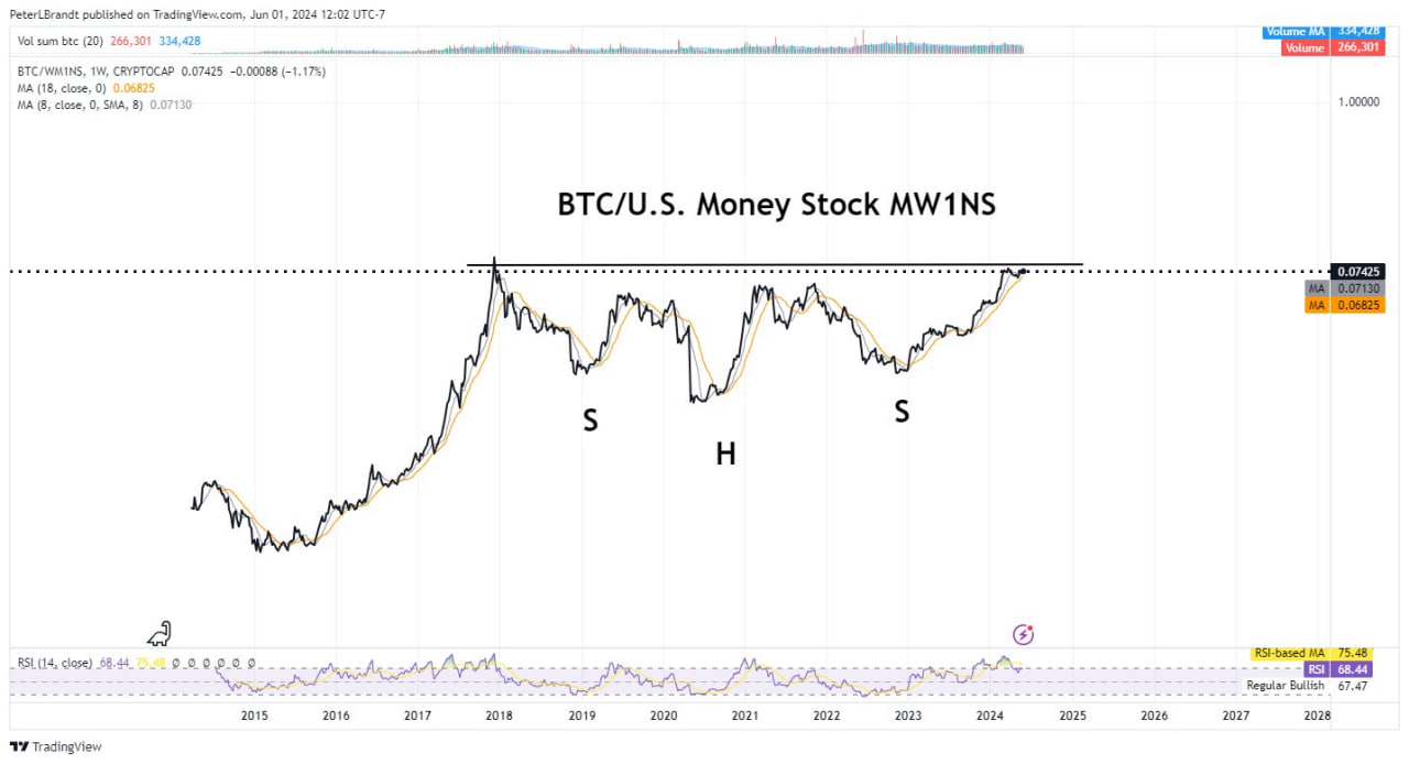 Influential trader Peter Brandt has some interesting charts this week on twitter. The first one shows the Dow Jones Industrial Average (DJIA) during the Great Stagflation of the 1970s, and the second one is Bitcoin divided by M1 money supply to show a similar pattern, not necessarily a connection.