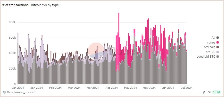 The use of layer 2 token protocols on Bitcoin has collapsed. Runes is a ghost town, signaling the massive lack of speculative interest in the space. This also matches with the struggles of altcoins to find any market what so ever right now.