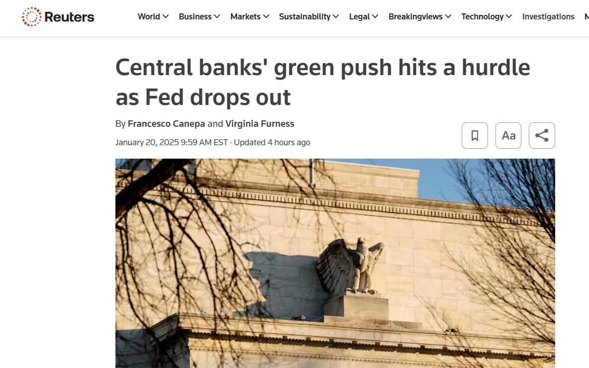 Central banks' green push hits a hurdle as Fed drops out