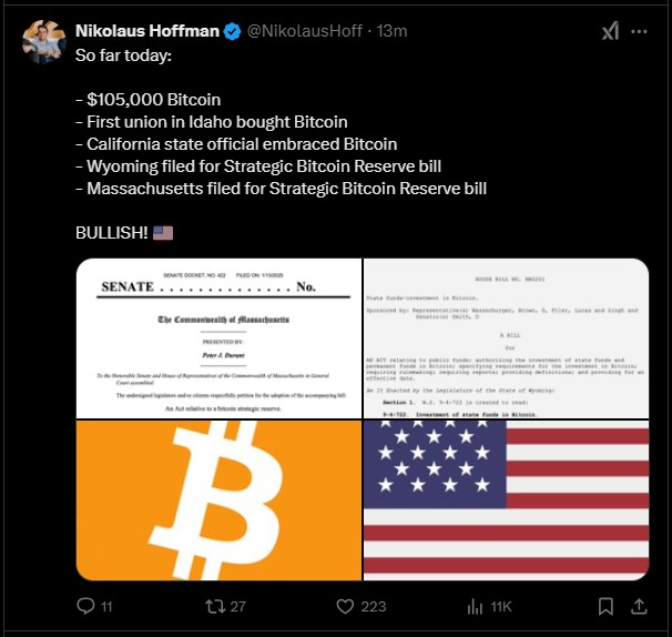This week, bitcoin reserve bills were introduced in Wyoming and Massachusetts. A California state official announced plans to introduce a bitcoin reserve bill, as well. Everything is happening so fast. Even the bluest of states are starting to follow. Soon it'll be a stampede.