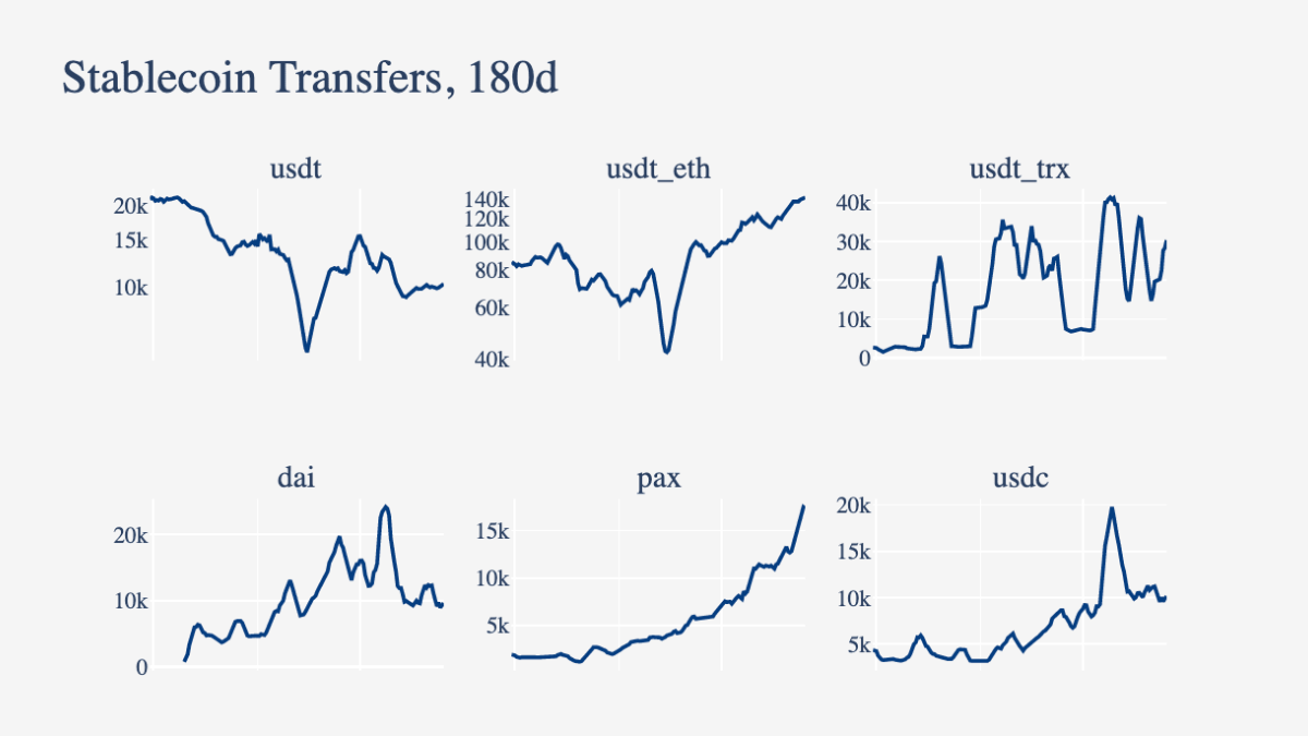 In the charts below via COINMETRICS, we can see the growth of stablecoins led again by Tether. They added nearly $1 billion in market cap in April alone. In the last 6 months, Tether has gone from roughly 100k total transactions per day to 150k, while others struggle to stay "stable".