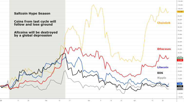Ethereum is still trying to make a go of it. They have their Phase 0 upgrade (of at least 7 needed for ETH2.0) scheduled for July. Chainlink is a derivative play on Ethereum as a network for smart contract oracles. Apart from being much more illiquid in userbase than bitcoin, ethereum is a hope-and-dreams investment. It's technically and economically inferior to the bitcoin stack, and chainlink acts like a leveraged play on ethereum.