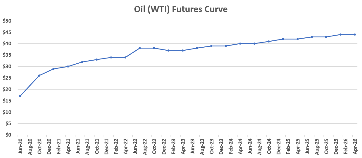 After the historic negative oil prices on Monday, let's take a look at the oil futures curve. It does not get to $45 all the way out to April 2026. Further out, the contract for Aug 2028 (not shown) is still under $50! The market is telling us peak oil demand has come and professionals expect this crisis to last much longer than expected. There's no V-shape recovery.