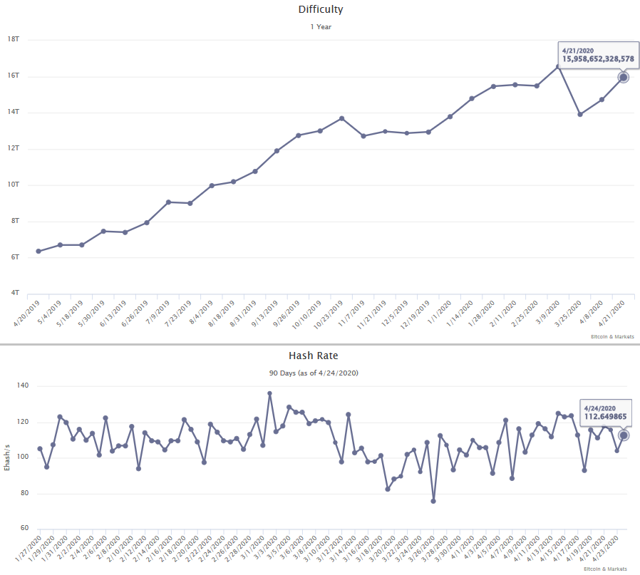 Difficulty increased by 8,45%. This is the one year chart you can find on our website. Difficulty is very near an ATH despite being below 50% from the ATH price. Several new more efficient and powerful mining rigs have come out recently, along with the halving, is pushing hash rate steadily up. Bitcoin mining is extremely healthy.