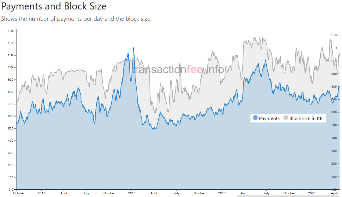 The first chart shows almost 4 years of block utilization (gray) and number of payments (blue). Block utilization is near peaks and the number of payments is climbing back up. The recent valley in payments is higher than previous and a good sign for layer 2 growth in during this bull market.