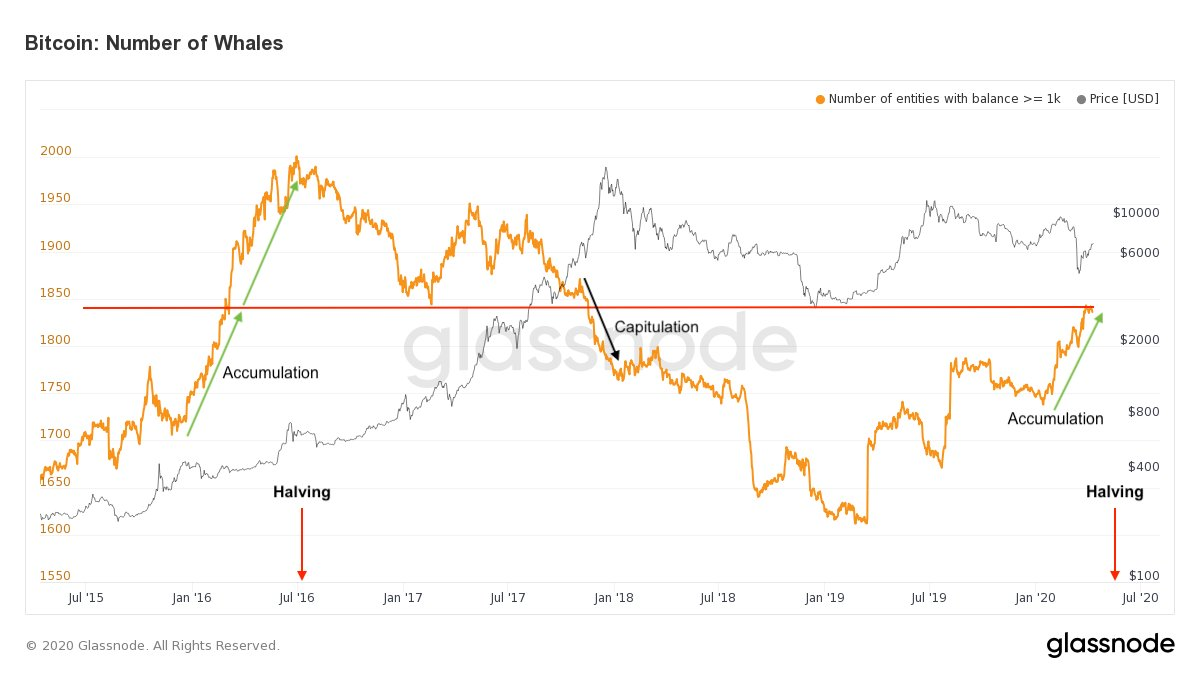 The second chart from user @ColeGarnerBTC shows the number of entities (filtered to not double counting known exchanges and businesses) with bitcoin balances over 1000 btc. This is an extremely useful metric at this price level, because a balance of 1000 bitcoins means that address contains over $7 million worth of bitcoin. Other stats like addresses with 1 btc, could be double counting a lot of holders, while the 1000 btc bar won't.