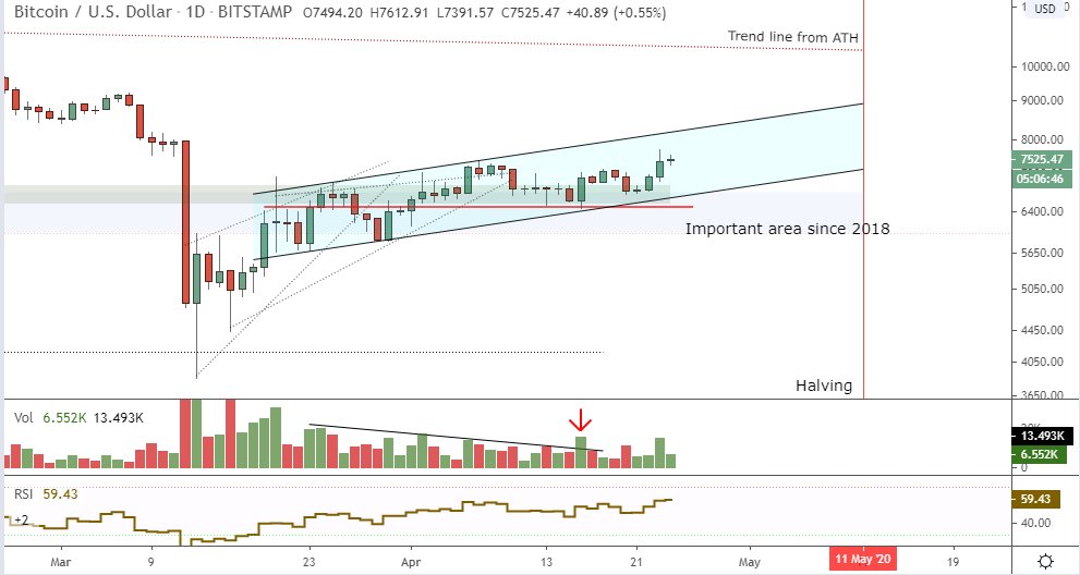 As our member newsletter has said, where you get more technical and fundamental analysis, "a slow scarcity driven climb is in order until levels get exciting." It'd be ideal to see a steady climb in the highlighted channel in the next two weeks until the halving.